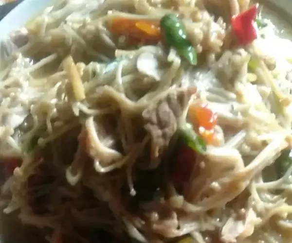 细米粉 1/2斤 卷心菜 少许 胡萝卜 少许 香菇 数朵虾米 1两 猪肉1两 水 4杯 酱油 2大匙 胡椒粉 1小匙 香油 少许 蒜末 1大匙