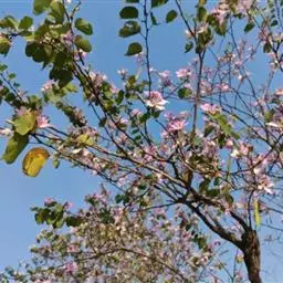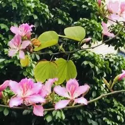 洋紫荆:落叶乔木;树皮暗褐色,近光滑;幼嫩部分常被灰色短柔毛;枝广展,硬而稍呈之字曲折,无毛。叶近…