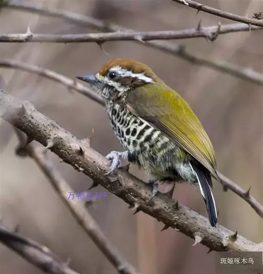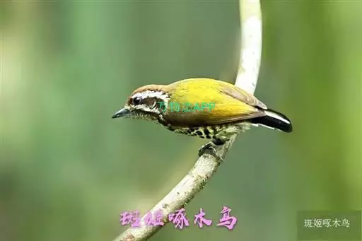 斑姬啄木鸟(学名:Picumnus innominatus),背至尾上覆羽橄榄绿色,两翅暗褐色,外缘沾黄绿色,翼缘近白色,翅上覆羽和内侧飞羽表面同背。尾羽黑色,中央一对尾羽内侧白色或黄白色,外侧3对尾羽有宽阔的斜行白色或淡黄白色次端斑。虹膜褐色或红褐色,嘴和脚铅褐色或灰黑色。常单独活动,多在地上或树枝上觅食,较少像其它啄木鸟那样在树干攀缘。繁殖期为4-7月。营巢于树洞中,每窝产卵3-4枚。