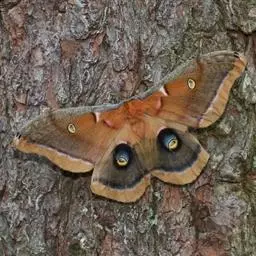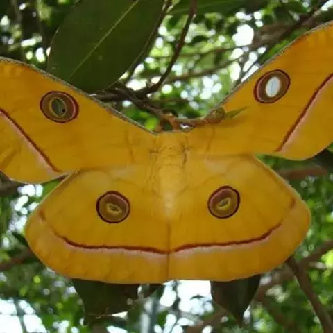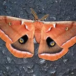 翅正面淡灰褐色,多褐色波纹状线,前后翅的外缘和亚缘线3条,中横线1条,前翅中室5条,从前室前缘到后翅cu2室有1列眼状纹,以两翅的m3室斑及cu1室斑为最显著,内半部橘红色,外半部黑色,围有白圈和褐圈。