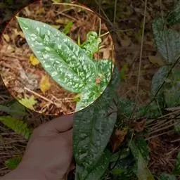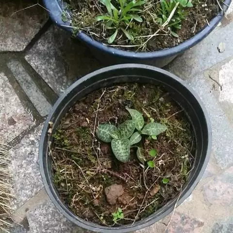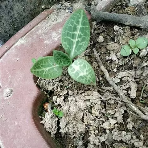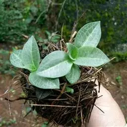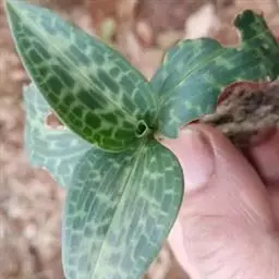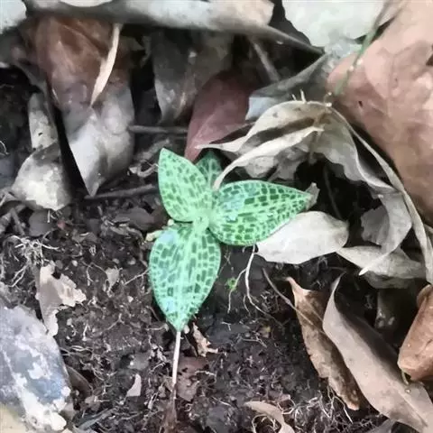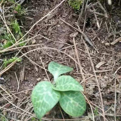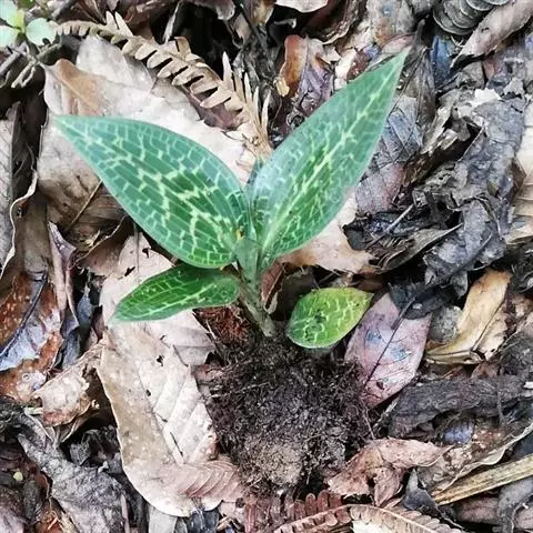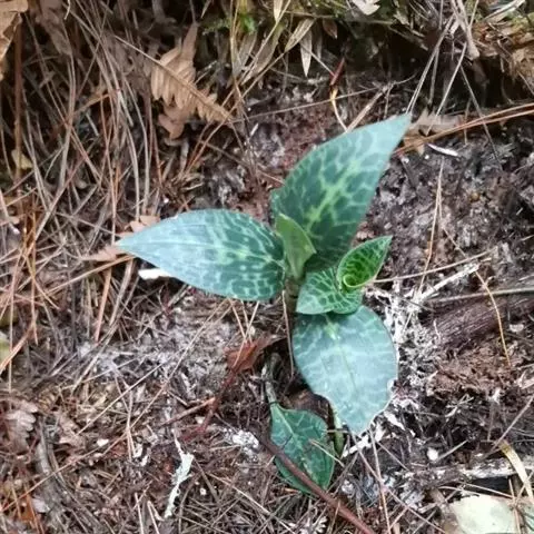 大花斑叶兰(学名:Goodyera biflora (Lindl.) Hook. f.):植株高5-15厘米。根状茎伸长,茎状,匍匐,具节。茎直立,绿色,具4-5枚叶。叶片卵形或椭圆形,长2-4厘米,宽1-2.5厘米,上面绿色,背面淡绿色,有时带紫红色,具柄。总状花序通常具2朵花,常偏向一侧;花大,长管状,白色或带粉红色,花瓣白色,无毛,稍斜菱状线形,长(2-)2.5厘米,宽3-4毫米,先端急尖;唇瓣白色,线状披针形。花期2-7月。