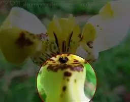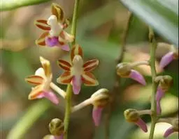 花瓣白色,无毛,稍斜菱状线形,长(2-)2.5厘米,宽3-4毫米,先端急尖;唇瓣白色,线状披针形,长1.8-2厘米,基部凹陷呈囊状,内面具多数腺毛,前部伸长,舌状,长为囊长的2倍,先端近急尖且向下卷曲;蕊柱短;花药三角状披针形,长1-1.2厘米;花粉团倒披针形,长1.2-1.6厘米;蕊喙细长,长1-1.2厘米,叉状2裂;柱头1个,位于蕊喙下方。花期2-7月。