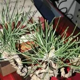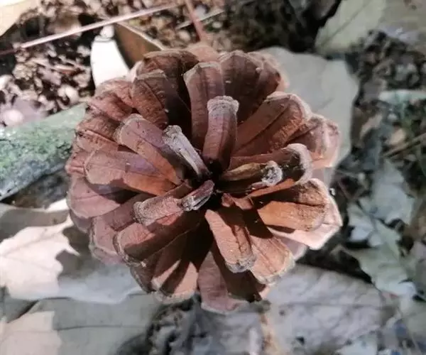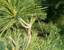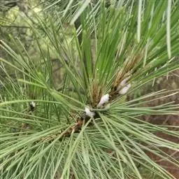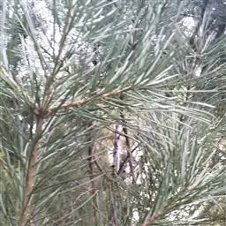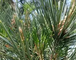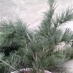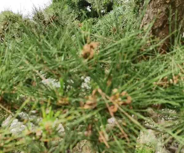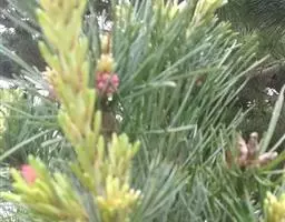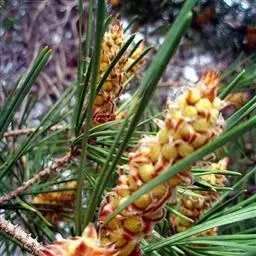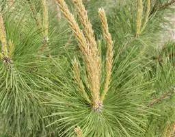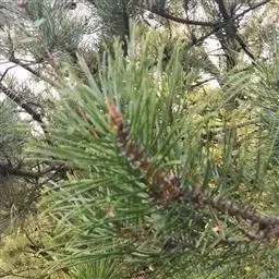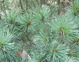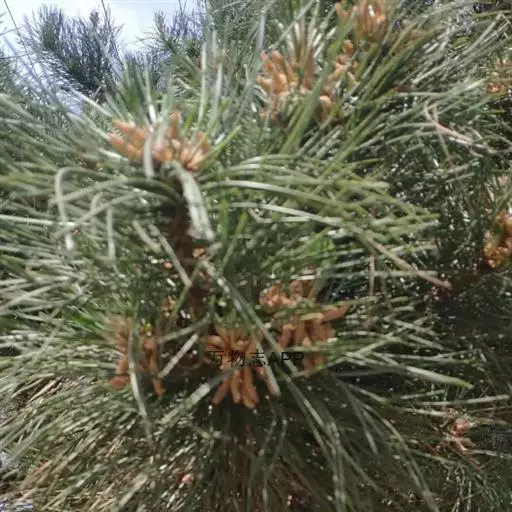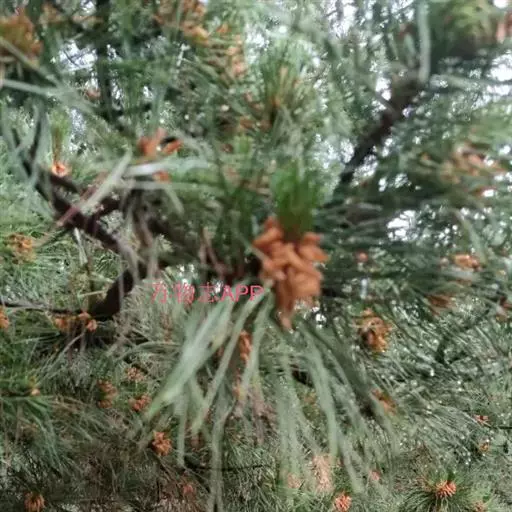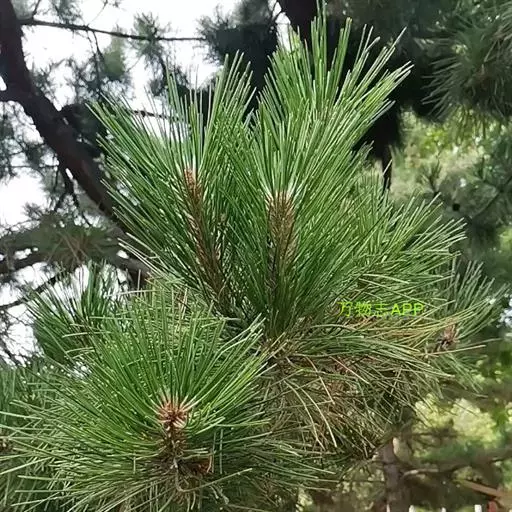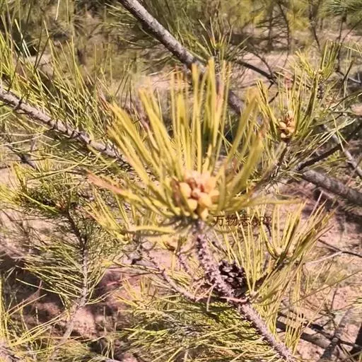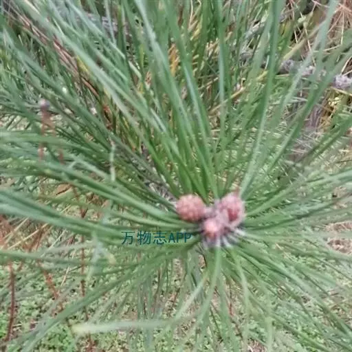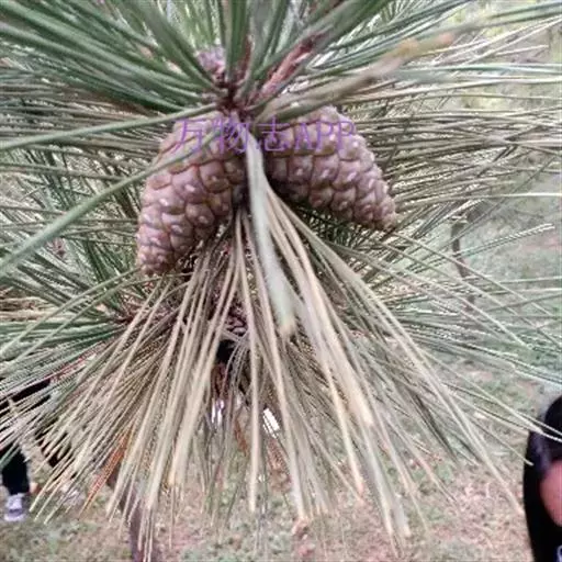 松树叶 针叶2针一束,稀3针一束,长12-20厘米,细柔,微扭曲,两面有气孔线,边缘有细锯齿;横切面皮下层细胞单型,第一层连续排列,第二层由个别细胞断续排列而成,树脂道约4-8个,在背面边生,或腹面也有2个边生;叶鞘初呈褐色,后渐变成灰黑色,宿存。雄球花淡红褐色,圆柱形,弯垂,长1-1.5厘米,聚生于新枝下部苞腋,穗状,长6-15厘米;雌球花单生或2-4个聚生于新枝近顶端,淡紫红色,一年生小球果圆球形或卵圆形,径约2厘米,褐色或紫褐色,上部珠鳞的鳞脐具向上直立的短刺,下部珠鳞的鳞脐平钝无刺。球果卵圆形或圆锥状卵圆形,长4-7厘米,径2.5-4厘米,有短梗,下垂,成熟前绿色,熟时栗褐色,陆续脱落;中部种鳞近矩圆状倒卵形,或近长方形,长约3厘米;鳞盾菱形,微隆起或平,横脊微明显,鳞脐微凹,无刺,生于干燥环境者常具极短的刺;种子长卵圆形,长4-6毫米,连翅长2-2.7厘米;子叶5-8枚;长1.2-2.4厘米;初生叶条形,长2.5-3.6厘米,叶缘具疏生刺毛状锯齿。