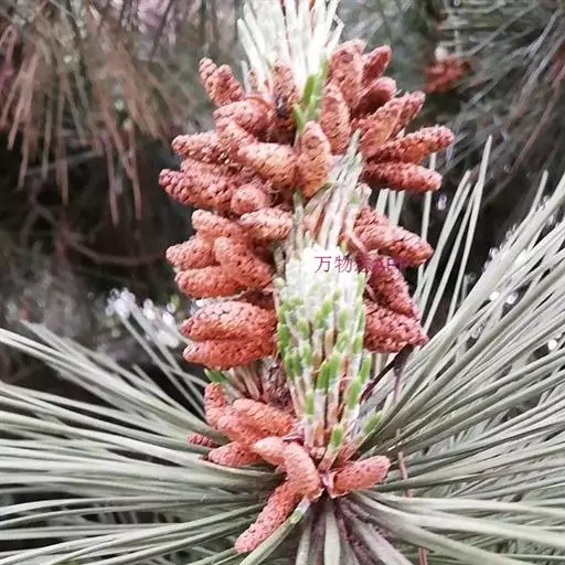 松树花 雌雄同株,球花单性;雄球花单生新枝下部苞腋,多数聚生,雄蕊多数,花药2,药室纵裂,花粉具两个发达的气囊,气囊和体接触面较小,界限明显,普遍都有显著的幅缘;雌球花有1-4个生于新枝近顶端,具多数珠鳞和苞鳞,每珠鳞的腹面基部着生两枚倒生胚珠,当年授粉,第二年便会迅速增大为球果。