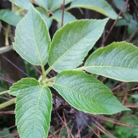 叶互生,小叶肥厚,基部楔形,变异很大,边缘有粗锯齿,叶片及叶脉对称。花枝上的叶宽卵形,长8~18cm,宽6~16cm,常3裂,或下部枝上的叶分裂成3小叶,基部心形。叶绿色,无毛,背面具有白粉,叶背叶脉处有柔毛,秋季变为鲜红色。幼枝上的叶较小,常不分裂。浆果小球形,熟时蓝黑色,被白粉,鸟喜食。花期6月,果期大概在9~10月 。
