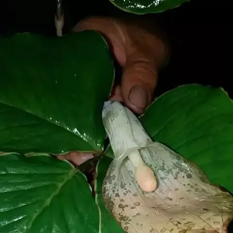 花序柄略长于叶柄,长12-22厘米,纤细。佛焰苞绿色、黄绿色,管部圆筒形,长2.5厘米,粗8毫米,喉部斜截形,无耳,几不外卷;檐部狭卵状披针形,长渐尖,长约6厘米,宽1.5-2厘米。肉穗花序单性,雄花序圆柱形,长1.5厘米,粗2毫米,花疏,雄花具短柄,花药2,药室圆球形,顶孔圆形;附属器纤细,无柄,线形,粗不及1毫米,长10-14厘米,由喉部水平外伸,然后下垂。花期6月。