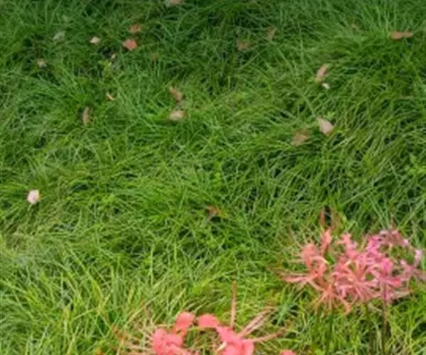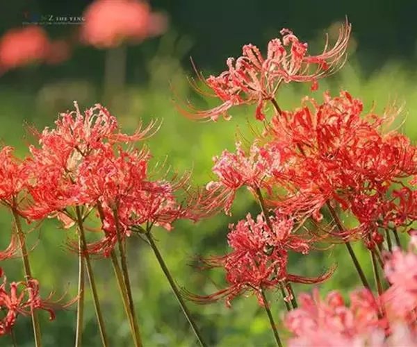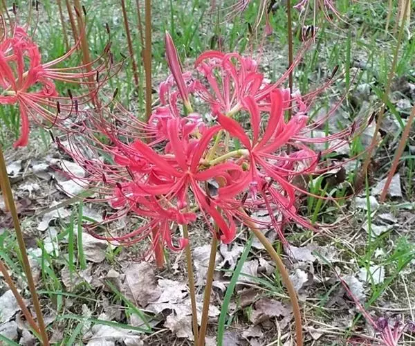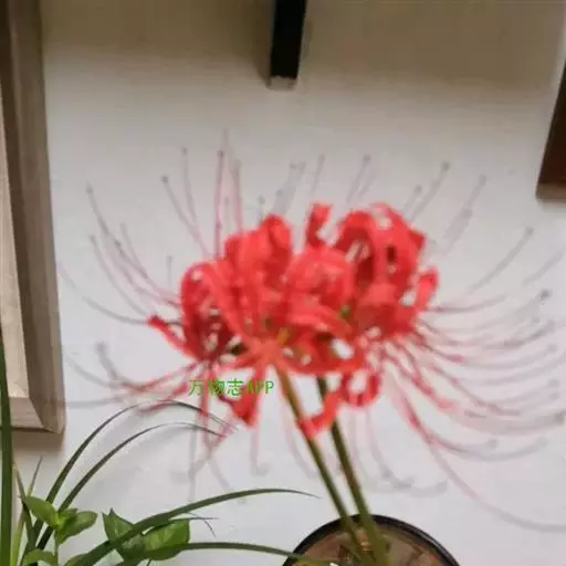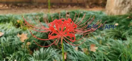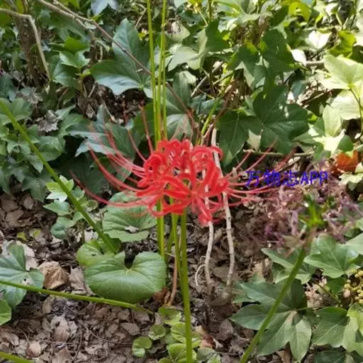 石蒜(学名:Lycoris radiata (L’Her.) Herb.):鳞茎近球形。秋季出叶,叶狭带状,顶端钝,深绿色,中间有粉绿色带;花茎高约30厘米;总苞片2枚,披针形;长约35厘米,宽约05厘米;伞形花序有花4-7朵;花鲜红色;花被裂片狭倒披针形,长约3厘米,宽约05厘米,强度皱缩和反卷;花被简绿色,长约05厘米;雄蕊显著伸出于花被外,比花被长1倍左右。花期8-9月,果期10月。