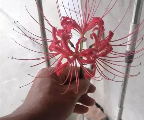石蒜是多年生草本植物,鳞茎近球形,直径1-3厘米。秋季出叶,叶狭带状,长约15厘米,宽约0.5厘米,顶端钝,深绿色,中间有粉绿色带。花茎高约30厘米;总苞片2枚,披针形,长约35厘米,宽约05厘米;伞形花序有花4-7朵,花鲜红色;花被裂片狭倒披针形,长约3厘米,宽约05厘米,强度皱缩和反卷,花被简绿色,长约05厘米;雄蕊显著伸出于花被外,比花被长1倍左右。花期8-9月,果期10月。