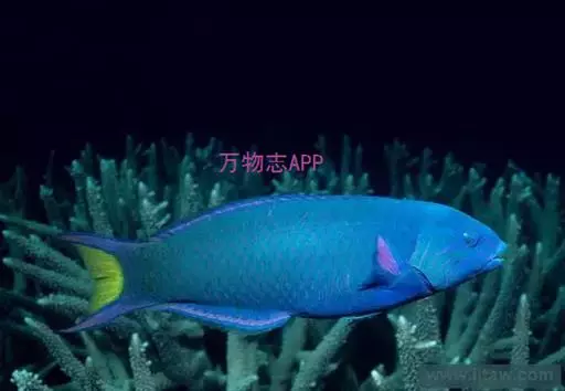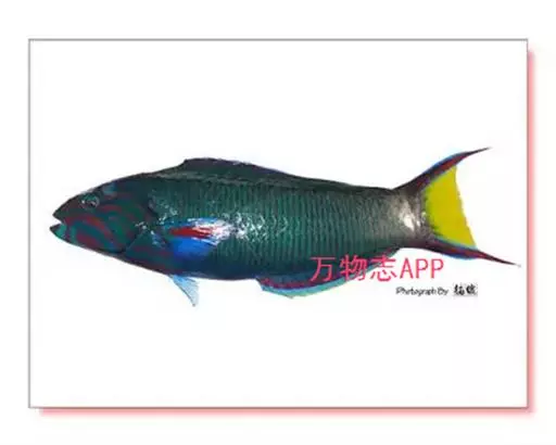 体侧扁。幼鱼背部黄而腹部白,背鳍与尾柄具黑斑;雌鱼草绿色,头部具粉红放射纹,尾鳍截形;雄鱼为宝蓝色,头部仍有花纹,特征是胸鳍紫红色且尾鳍中央亮黄色。
