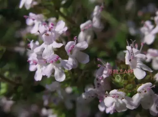百里香(学名:Thymus mongolicus Ronn),半灌木,叶为卵圆形,花序头状,花萼管状钟形或狭钟形,花冠紫红、紫或淡紫、粉红色,花期7-8月,小坚果近圆形或卵圆形。可作为食材,欧洲烹饪常用香料,味道辛香,用来加在炖肉、蛋或汤中。欧洲传统上认为百里香象征勇气,所以中世纪经常用它赠给出征的骑士。在中国称为地椒、地花椒、山椒、山胡椒、麝香草等,产于西北地区。元朝的《居家必用事类全集》中,记有用百里香加入驼峰驼蹄调味。李时珍《本草纲目》记载:“味微辛,土人以煮羊肉食,香美。”百里香原产于南欧,被作为一种美食的香料而广泛种植。