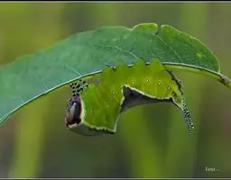 初龄幼虫头部与身体均呈暗褐色,但末端白色。其后随幼虫的成长而色彩渐淡,至4龄时全体底色已转为绿色。胸部每节各有1对圆锥形突,初龄时淡褐色;2龄时呈蓝黑色而有金属光泽;到末龄时中胸的突起变小而后胸的突起变为肉瘤,中央出现淡褐色纹,体上出现1条黄色横线与之相连;气门淡褐色;臭角淡黄色。即将化蛹时体色为淡绿色半透明。
