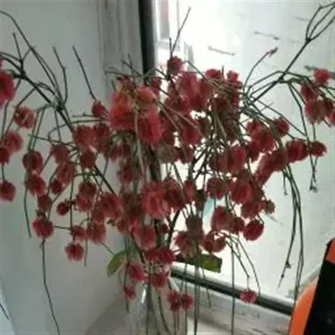 老枝圆柱形,有节,暗褐色,上有纵线条;幼枝扁平,多节,绿色,形似叶片。叶退化,全缺或有数枚披针形小叶片,基部三角楔形,托叶退化为线条。总状花序簇生在新枝条的节上,形小,淡红色或绿白色。果为红色或淡紫色的浆果。竹节蓼为多年生直立草本,高0.6~2米。茎基部圆柱 竹节蓼花 形,木质化,上部枝扁平,呈带状,宽7~12毫米,深绿色,具光泽,有显著的细线条,节处略收缩,托叶鞘退化成线状,分枝基部较窄,先端锐尖。叶多生于新枝上,互生,菱状卵形,长4~20毫米,宽2~10毫米,先端渐尖,基部楔形,全缘或在近基部有一对锯齿,羽状网脉,无柄。花小,两性,具纤细柄;苞片腆质,淡黄棕色;花被4~5深裂,裂片矩圆形,长约1毫米,淡绿色,后变红色;雄蕊6~7,花丝扁,花药白色;雌蕊1,子房上位,花柱短,3枚,杜头分叉。疫果三角形,包于红色内质的花被内。花期9~10月。果期10~11月。