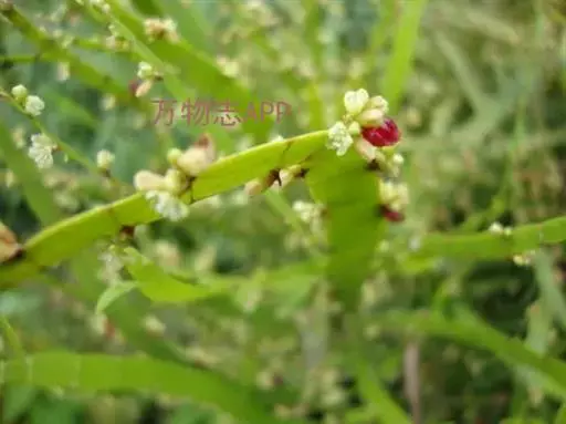 竹节蓼一般是多枝丛生,茎部开始还是圆的,向上逐渐分枝,经过几次分枝,分出的枝就全部扁化了,一直到枝的顶端。竹节蓼的扁化枝看上和竹子的叶子差不多,有平行脉,而且有一节节的分节,在分节的地方,有时候也会长出一些小叶子,不过这些叶子要是在干旱的环境里,很快也会脱落的。