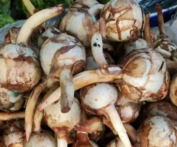采收时间因地区不同而异。山东一带自秋季初霜后(茎叶枯黄时)到第2年球茎发芽前,即11月至翌年3月,可随时采收,在霜降到大雪期间采收较多,在地上部茎叶刚枯黄时采收产量较低,一般延迟采收产量高。这是因为茎叶刚枯黄时,短缩茎中的养分仍可继续向球茎输送,使球茎继续膨大,从而增加产量。所以,在10月底到11月初排去田水,并割去慈姑叶片,留茬15厘米左右。割叶后每隔2m开沟,沟深30厘米左右,畦面晒干并整细,套种越冬青菜,既可增加慈姑产量,又可在1-2月蔬菜淡季供应上市,提高经济效益。