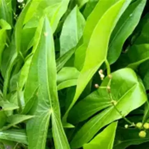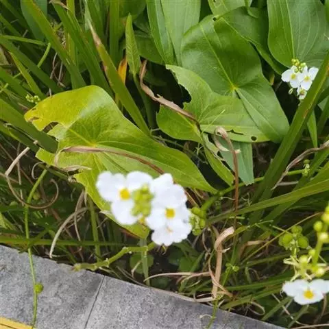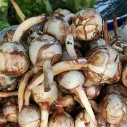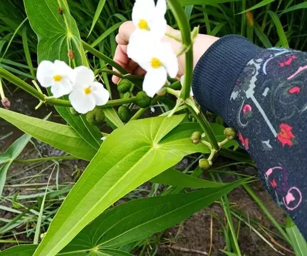 慈姑(学名:Sagittaria trifolia L. var. sinensis (Sims.) Makino )泽泻科多年生草本植物,生在水田里,叶子像箭头,开白花。地下有球茎,黄白色或青白色,以球茎作蔬菜食用。可以吃。也作茨菰。本变种与原变种不同在于:植株高大,粗壮;叶片宽大,肥厚,顶裂片先端钝圆,卵形至宽卵形;匍匐茎末端膨大呈球茎,球茎卵圆形或球形,可达5-8×4-6厘米;圆锥花序高大,长20-60厘米,有时可达80厘米以上,着生于下部,具1-2轮雌花,主轴雌花3-4轮,位于侧枝之上;雄花多轮,生于上部,组成大型圆锥花序,果期常斜卧水中;果期花托扁球形,直径4-5毫米,高约3毫米。种子褐色,具小凸起。