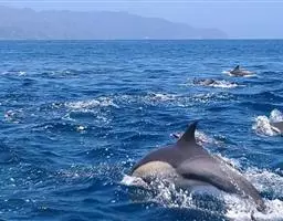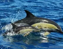 真海豚,身体细而流线型。体色十分复杂而独特,通常十字交叉型,黄褐色在前灰色在后,背面黑色向下延伸,…
