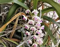 大叶隔距兰(学名:Cleisostoma racemiferum (Lindl. ) Garay):茎直立,粗壮,长5-20厘米,连同叶鞘粗2-2.5厘米,具分枝、长而粗壮的根。叶厚革质,扁平、带状,长达29厘米,宽3-4厘米,基部具1个关节和抱茎的叶鞘。花序出自叶腋,比叶长,多分枝;花序柄粗壮,圆锥花序疏生许多花;花瓣长圆形,长3毫米,宽2毫米,先端钝;唇瓣白色,3裂;药帽前端收狭为喙状。花期6月。