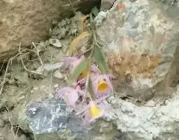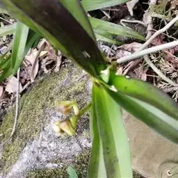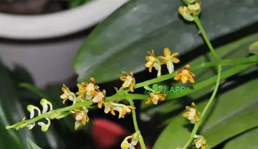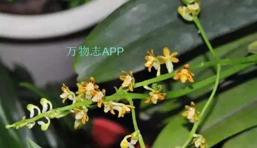 花序出自叶腋,比叶长,多分枝;花序柄粗壮,圆锥花序疏生许多花;花苞片小,卵状披针形,长1-2毫米,先端渐尖;花梗和子房长4毫米;萼片和花瓣黄色带褐红色斑点;中萼片近长圆形,凹下呈舟状,长约3.5毫米,宽2.5毫米,先端钝;侧萼片稍斜长圆形,与中萼片近等大,先端圆形,基部贴生于蕊柱足。