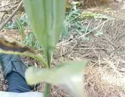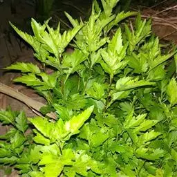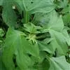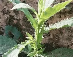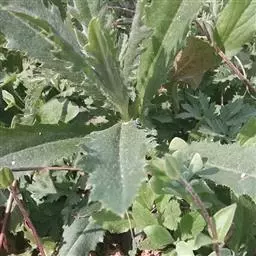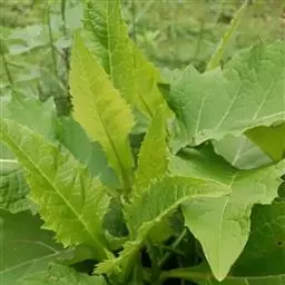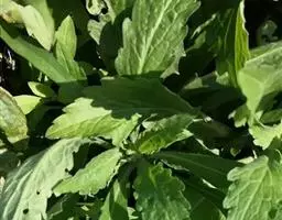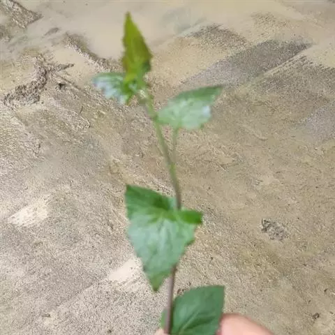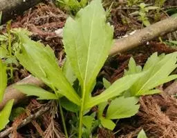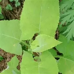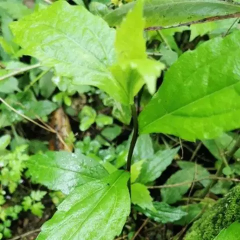 基部叶卵状披针形,花期枯萎;中部叶卵圆形或卵形,开展,长3.5-12厘米,宽1.8-6厘米,基部宽楔形,下延成具翼而长1-3厘米的柄,先端渐尖,边缘有尖头状规则或不规则的粗齿;上部叶渐小,披针形或卵状披针形;全部叶上面深绿色,下面淡绿色,基出三脉,侧脉和网脉明显,两面被平伏短柔毛,沿脉有长柔毛。