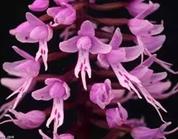花葶从假茎上端的叶间抽出,长18-30厘米,密被短毛,总状花序长6-8厘米,疏生约10朵花;花苞片宿存,膜质,卵状披针形,长4-7毫米,先端渐尖或急尖,近无毛;花梗和子房长6-13毫米,弧曲,密被短毛,子房棒状;花瓣有多种颜色,尤其在日本,园艺品种很多,花朵极漂亮。萼片褐紫色;中萼片稍斜的椭圆形,长11-13毫米,中部宽6-7毫米,先端急尖,具5条脉,背面中部以下被短毛;侧萼片相似于中萼片。