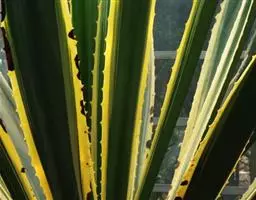最初在叶面上出现浅色、椭圆形、边缘不明显,直径1mm左右的病斑,随后扩大成褐色凹陷的大病斑,上面产生小黑点。病菌可以穿透叶片生长,使纤维受到严重的损害。可用0.3%~1%多菌灵或波尔多液防治。