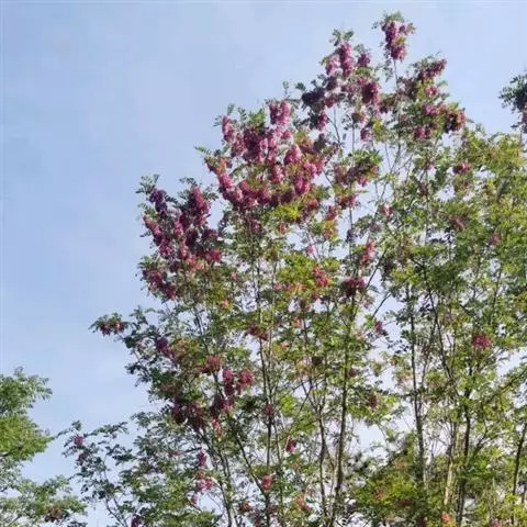 毛洋槐的繁殖大多用刺槐作砧木进行嫁接,嫁接一般在春季萌芽前进行,多采用切接法。砧木应选择胸径6厘米以上,且经多次移栽的刺槐,砧木树干通直,长势旺盛且无病虫害。接穗可选择长势健壮且无病虫害的植株上选取,一般选择2年生木质化程度较高的枝条作接穗,接穗长度一般在8-10厘米。嫁接时,接穗应削成楔形插入,接穗和砧木的皮层对合好,然后用塑料带紧紧缠绕,勿使其松动,嫁接处用蜡密封,然后套上一个塑料袋进行保湿。20天左右伤口可愈合,接穗抽绳出芽子。
