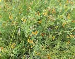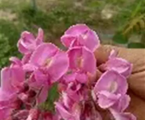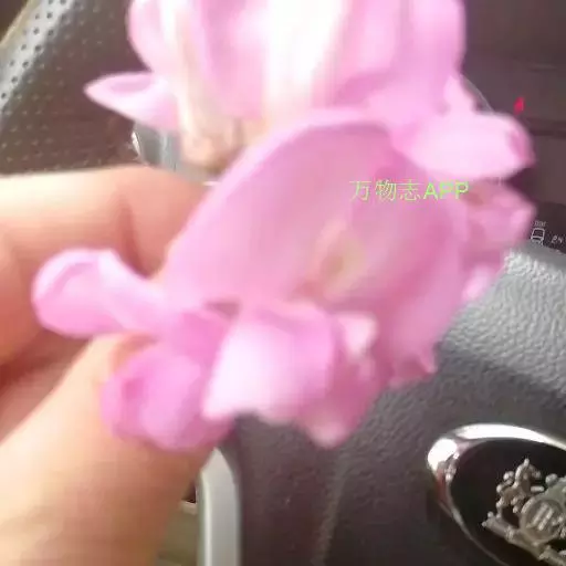 总状花序腋生,除花冠外,均被紫红色腺毛及白色细柔毛,花3-8朵;总花梗长4-8.5厘米;苞片卵状披针形,长5-6毫米,有时上部3裂,先端渐尾尖,早落;花萼紫红色,斜钟形,萼筒长约5毫米,萼齿卵状三角形,长3-6毫米,先端尾尖至钻状;花冠红色至玫瑰红色,花瓣具柄,旗瓣近肾形,长约2厘米,宽约3厘米,先端凹缺,翼瓣镰形;长约2厘米,龙骨瓣近三角形,长约1.5厘米,先端圆,前缘合生,与翼瓣均具耳;雄蕊二体,对旗瓣的1枚分离,花药椭圆形;子房近圆柱形,长约1.5厘米,密布腺状突起,沿缝线微被柔毛,柱头顶生,胚珠多数,荚果线形,长5-8厘米,宽8-12毫米,扁平,密被腺刚毛,先端急尖,果颈短,有种子3-5粒。花期5-6月,果期7-10月。