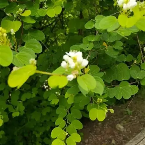 直立或攀援小灌木;小枝纤细,具棱,被微柔毛,很快变秃净。叶纸质或膜质,近圆形,通常宽度大于长度,长3-6厘米,宽4-7厘米,基部近截形、阔圆形或有时浅心形,先端2裂达中部,罅口狭,裂片先端圆钝,上面无毛,下面略被稀疏的微柔毛,多少具松脂质丁字毛;基出脉7-9(-11)条;托叶丝状早落;叶柄纤细,长6-16毫米,具沟,略被微柔毛。伞房式总状花序侧生,连总花梗长1.5-3厘米,有密集的花十余朵;总花梗短,与花梗同被短柔毛;苞片线形,锥尖,早落;花蕾椭圆形,多少被柔毛;花托陀螺形;萼佛焰状,裂片2;花瓣白色,倒披针形,连瓣柄长7-8毫米,具羽状脉;能育雄蕊通常10枚,其中5枚较长,花丝长5-6毫米,无毛;子房被茸毛,具短的子房柄,柱头盾状。荚果长圆形,扁平,长5-7.5厘米,宽9-12毫米,两端渐狭,中部两荚缝近平行,先端具短喙,成熟时开裂,果瓣革质,初时被短柔毛,渐变无毛,平滑,开裂后扭曲;种子2-4颗,卵形,略扁平,褐色,有光泽。花期5-7月;果期8-10月。 [2-3]