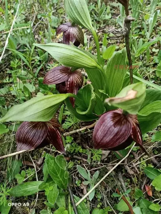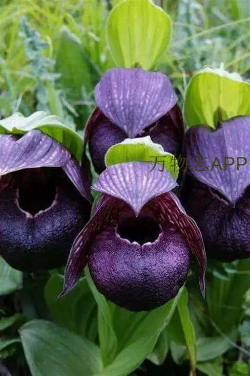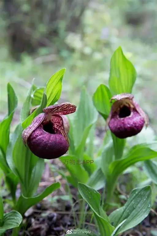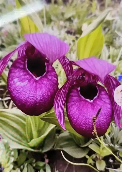 西藏杓兰(学名:Cypripedium tibeticum King ex Rolfe):植株高15-35厘米,具粗壮、较短的根状茎。茎直立,无毛或上部近节处被短柔毛,通常具3枚叶。叶片椭圆形、卵状椭圆形或宽椭圆形。花序顶生,具1花;花苞片叶状,椭圆形至卵状披针形,花大,俯垂,紫色、紫红色或暗栗色,通常有淡绿黄色的斑纹,花瓣上的纹理尤其清晰,唇瓣的囊口周围有白色或浅色的圈;中萼片椭圆形或卵状椭圆形;花瓣披针形或长圆状披针形,长3.5-6.5厘米,宽1.5-2.5厘米,先端渐尖或急尖,内表面基部密生短柔毛,边缘疏生细缘毛;唇瓣深囊状,近球形至椭圆形。花期5-8月。