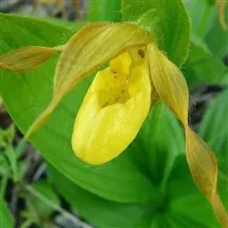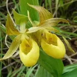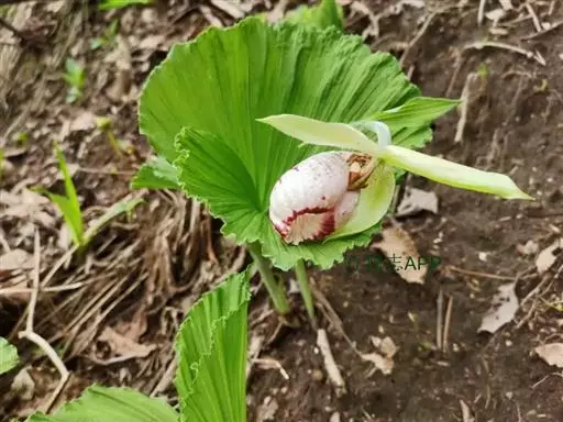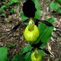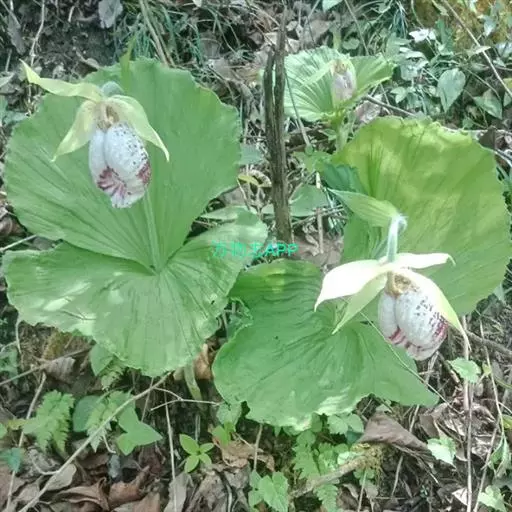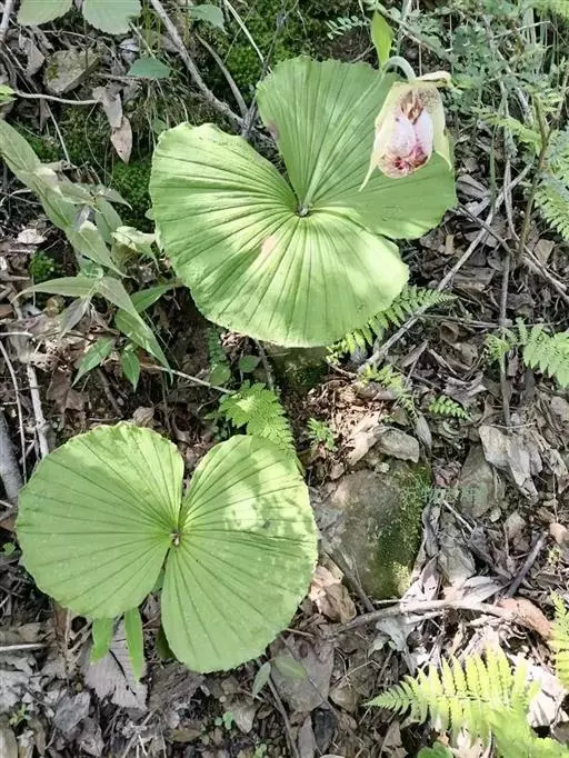 扇脉杓兰(学名:Cypripedium japonicum Thunb.):植株高35-55厘米,具较细长的、横走的根状茎;茎直立,被褐色长柔毛,基部具数枚鞘,顶端生叶。叶通常2枚,近对生,位于植株近中部处,叶片扇形。花序顶生,具1花;花俯垂;萼片和花瓣淡黄绿色,基部多少有紫色斑点,唇瓣淡黄绿色至淡紫白色,多少有紫红色斑点和条纹;花瓣斜披针形,长4-5厘米,宽1-1.2厘米,先端渐尖,内表面基部具长柔毛;唇瓣下垂,囊状,近椭圆形或倒卵形。蒴果近纺锤形,疏被微柔毛。花期4-5月,果期6-10月。