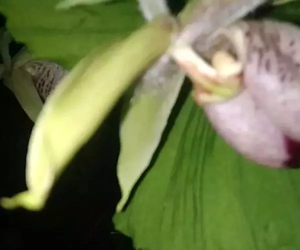 花序顶生,具1花;花序柄亦被褐色长柔毛;花苞片叶状,菱形或卵状披针形,长2.5-5厘米,宽1-2(-3)厘米,两面无毛,边缘具细缘毛;花梗和子房长2-3厘米,密被长柔毛;花俯垂;萼片和花瓣淡黄绿色,基部多少有紫色斑点,唇瓣淡黄绿色至淡紫白色,多少有紫红色斑点和条纹;中萼片狭椭圆形或狭椭圆状披针形,长4.5-5.5厘米,宽1.5-2厘米,先端渐尖,无毛;合萼片与中萼片相似,长4-5厘米,宽1.5-2.5厘米,先端2浅裂。