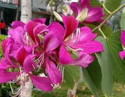 二回羽状复叶,长10-15厘米;总叶柄及叶轴有钩刺4-5列;羽片(4-)7-8对,长2-4厘米;小叶(12)20-30对,线状长圆形,长3-5毫米,宽约1毫米,被白色长柔毛。头状花序花时连花丝直径约1厘米,1或2个生于叶腋,总花梗长5-10毫米;花紫红色,花萼极小,4齿裂;花冠钟状,长2.5毫米,中部以上4瓣裂,外面稍被毛;雄蕊8枚,花丝长为花冠的数倍;子房圆柱状,花柱细长。