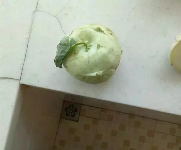 【捷克白苤蓝】:由国外引入,已栽培多年。植株较小,叶子少,叶丛较直立。叶长卵形,浅灰绿色,叶面蜡粉较多;叶柄浅绿色。球茎扁圆球形,皮白绿色,皮薄,光滑,叶痕小而平。肉质淡白绿色,纤维少,质脆嫩,味稍甜,品质好。该品种突出特点是早熟,丰产,抗病。单株球茎重500克左右。
