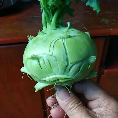 二年生粗壮直立草本,高30~60厘米。全株光滑无毛。茎短,离地面2~4厘米处,开始膨大而成为一坚硬的、长椭圆形、球形或扁球形、具叶的肉质球茎,直径5~10厘米,或过之;外皮通常淡绿色,亦有绿色或紫色者,内部的肉白色。叶长20~40厘米,其中有1/2~1/3为叶柄;叶片卵形或卵状矩圆形,光滑,被有白粉,边缘有明显的齿或缺刻,近基部通常有1~2裂片;花茎上的叶似茎叶而较小,叶柄柔弱。