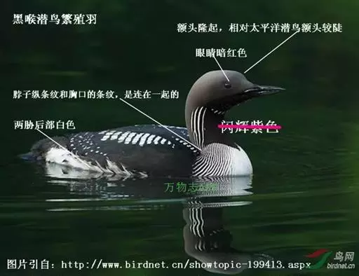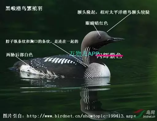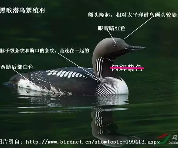 与之相似的红喉潜鸟冬羽较淡,嘴微向上翘;夏羽前颈有栗色斑,背无长方形白色斑块;太平洋潜鸟夏羽头和后颈较淡,前颈具紫色光泽而不是绿色光泽,嘴亦较细小,冬羽体色较淡,后胁白色消失或不明显,颏部多数具有黑纹;白嘴潜鸟夏羽头颈黑色,嘴黄色,粗厚而上翘,冬羽眼周有一圈白色,耳覆羽常常有黑斑,前后颈分界线不明显,嘴黄色,粗厚而上翘,均与黑喉潜鸟明显不同,容易区别。
