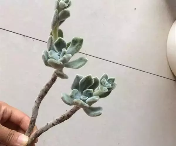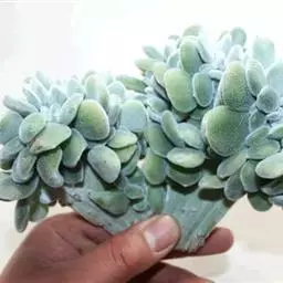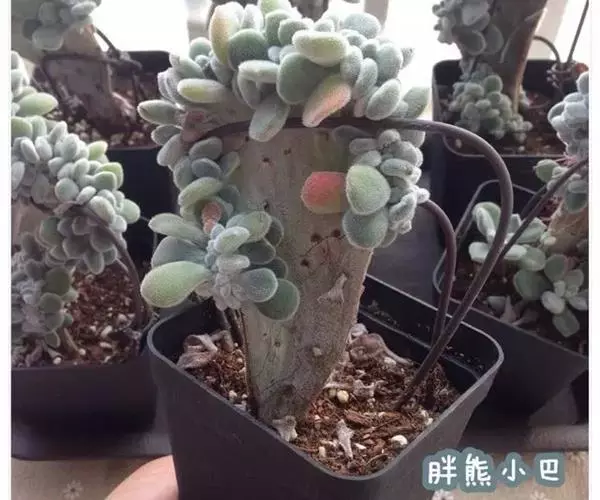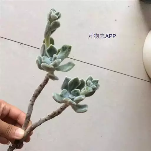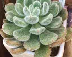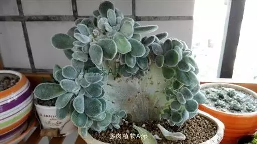 叶片与茎部多肉化,茎部短缩粗壮。匙形叶片肥厚,叶尖圆钝,尖端常枯黄。全株具有绒毛,叶片上白色绒毛长度可达0.2mm。冬春季开花,总状花序自叶腋伸出,花朵钟形橘黄色。 景天科拟石莲花属,植物的特别之处,是顶端点缀着红褐色,被厚厚绒毛包裹的绿色叶片。