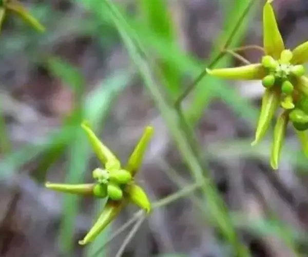 多年生直立草本,高约1米;根须状,多至50余条;茎不分枝,稀从根部发生几条,无毛或被微生。叶对生,纸质,披针形至线形,长5-13厘米,宽5-15毫米(最大达13×1.5厘米),两端锐尖,两面无毛或叶面具疏柔毛,叶缘有边毛;侧脉不明显;叶柄长约3毫米,圆锥状聚伞花序生于顶端的叶腋内,长达7厘米,着花10余朵;花萼内的腺体或有或无;花冠黄绿色,近辐状,裂片长达4毫米,宽3毫米;副花冠裂片5,基部增厚,顶端钝;花粉块每室1个,下垂;子房椭圆形;柱头5角形,顶端略为突起。蓇葖单生,披针形,长6厘米,直径6毫米,向端部长渐尖;种子长圆形,长3毫米;种毛白色绢质,长1厘米。花期5-7月,果期9-12月。