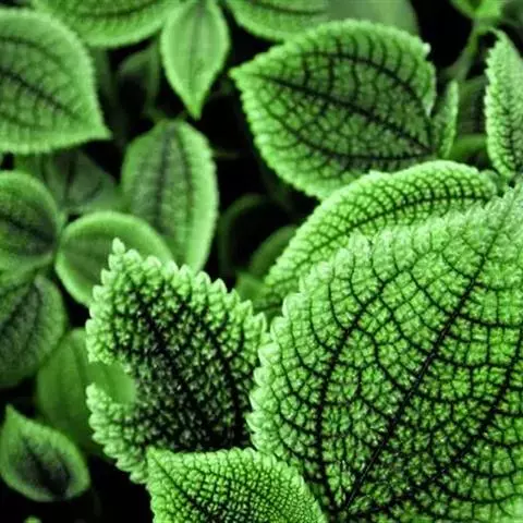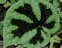 植株细小,具粗壮肥大的肉质根状茎,根状茎匍匐生长,有极短的节,叶和花均从根状茎上长出,在靠近土面处长成一蔟。其叶片卵圆形,具长柄,叶柄绿色,有红褐色斑点,叶长约4 厘米,叶面暗红褐色,有不规则的绿色斑块,叶缘具白毛。花粉白色,不甚显著。其叶片斑斓,株形紧凑,是优良的观叶植物,宜用小盆栽种,点缀窗台、几案、书桌等处。