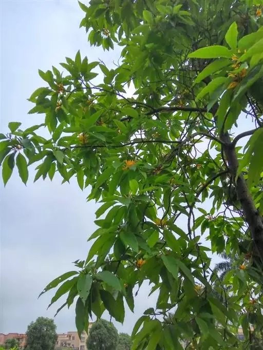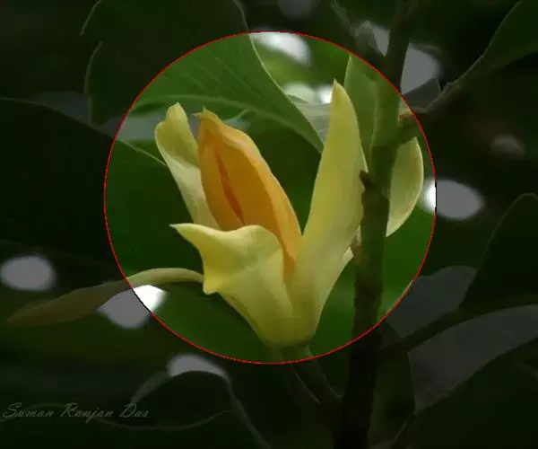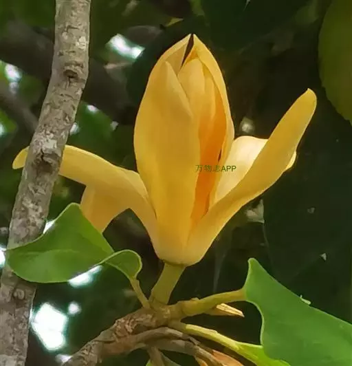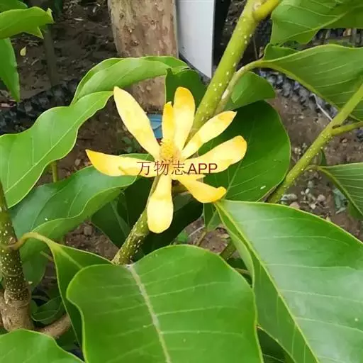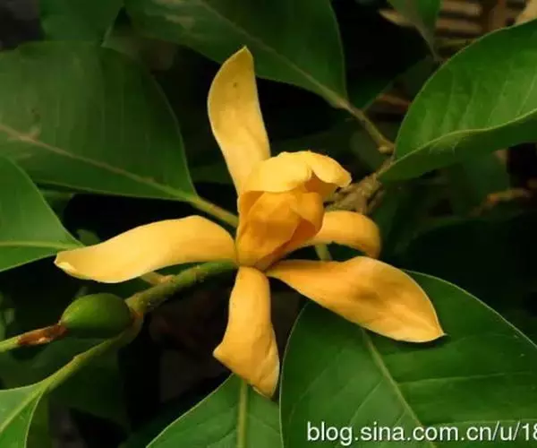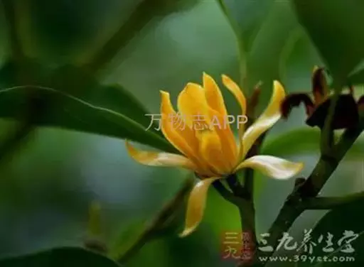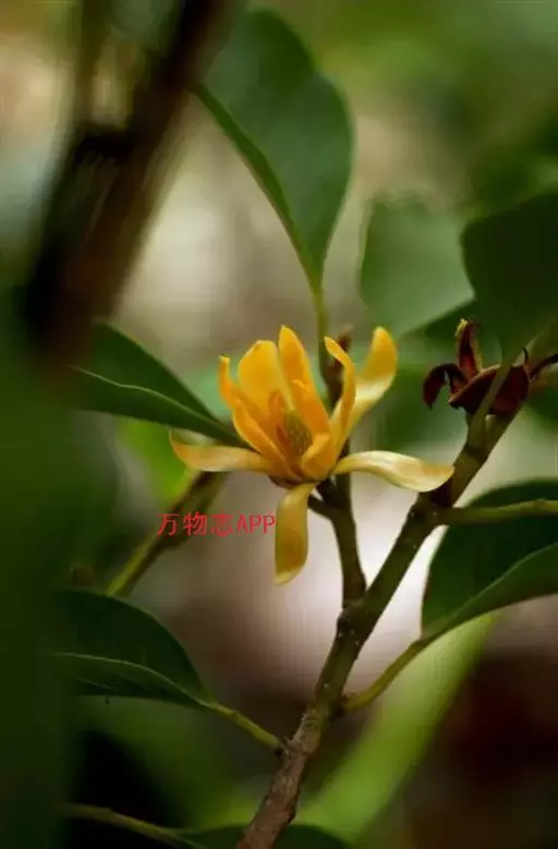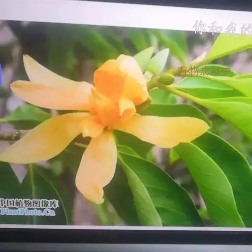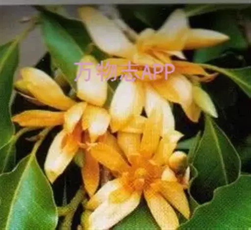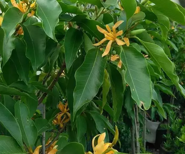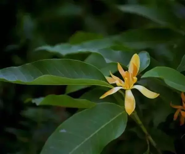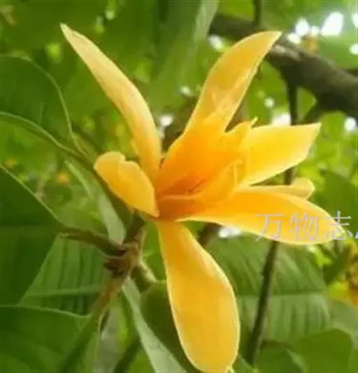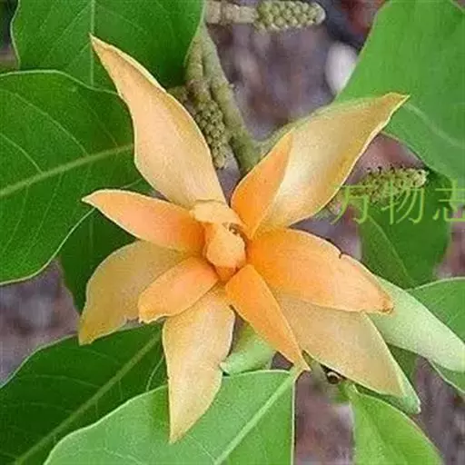 黄兰(Michelia champaca Linn.):常绿乔木,高达10余米;枝斜上展,呈狭伞形树冠;芽、嫩枝、嫩叶和叶柄均被淡黄色的平伏柔毛。叶薄革质,披针状卵形或披针状长椭圆形,下面稍被微柔毛。花黄色,极香,花被片15-20片,倒披针形,长3-4厘米,宽4-5毫米;蓇葖倒卵状长圆形,长1-1.5厘米,有疣状凸起;种子2-4枚,有皱纹。花期6-7月,果期9-10月。