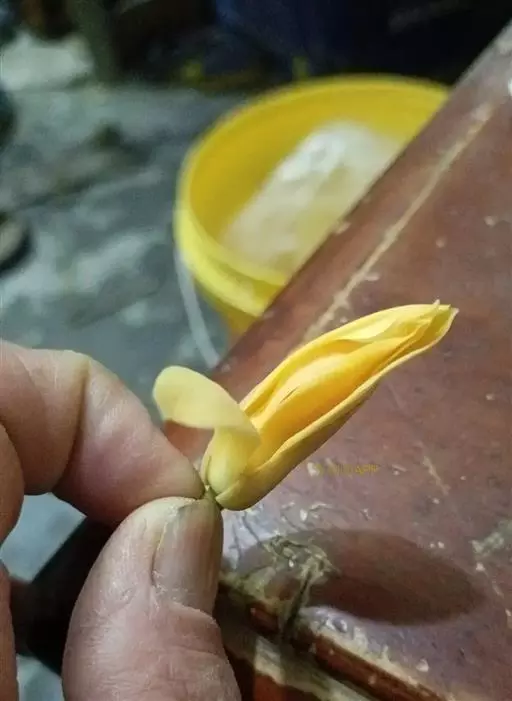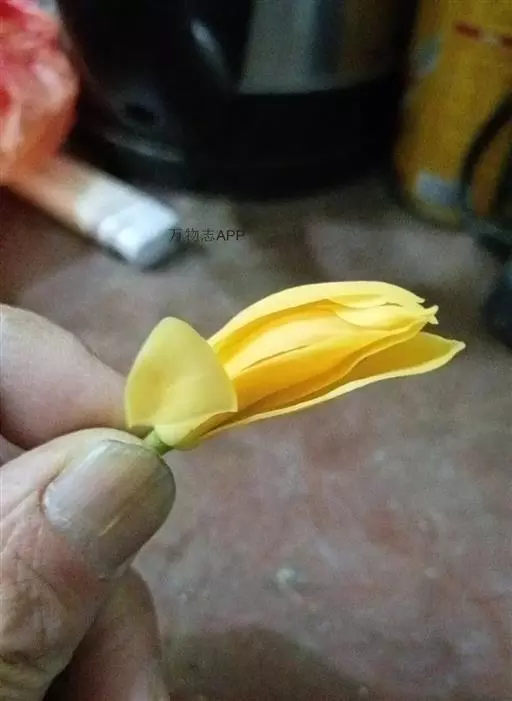 花黄色,极香,花被片15-20片,倒披针形,长3-4厘米,宽4-5毫米;雄蕊的药隔伸出成长尖头;雌蕊群具毛;雌蕊群柄长约3毫米。聚合果长7-15厘米;蓇葖倒卵状长圆形,长1-1.5厘米,有疣状凸起;种子2-4枚,有皱纹。花期6-7月,果期9-10月。