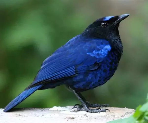 雌雄鸟同型。属体型略小的啸鸫,通体黑蓝,上体无金属闪辉羽片,胸具蓝色闪辉羽片。额蓝黑色,上喙基至眼先有鹅绒状黑色细毛,头顶和体背黑色,腰部各羽羽基白色。尾羽紫黑色,外缘深紫蓝色。小、中覆羽天蓝色,大覆羽黑色。初级飞羽黑色,羽缘蓝色。喉、胸黑色,各羽羽缘为闪光蓝色,呈鳞片状,腹和尾下覆羽黑色,脇及下腹各羽羽基白色。喙黑色,跗蹠及趾黑色。