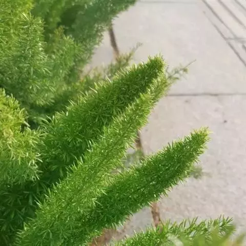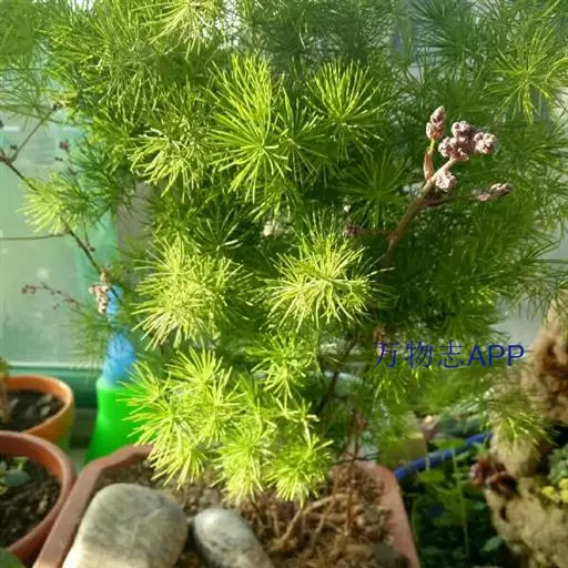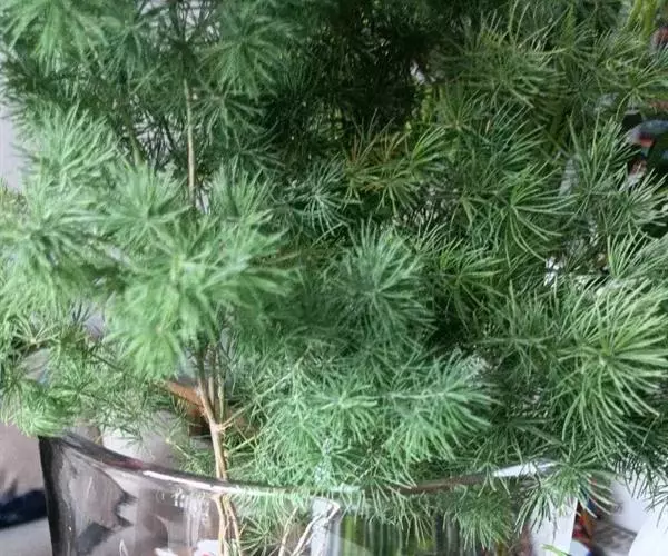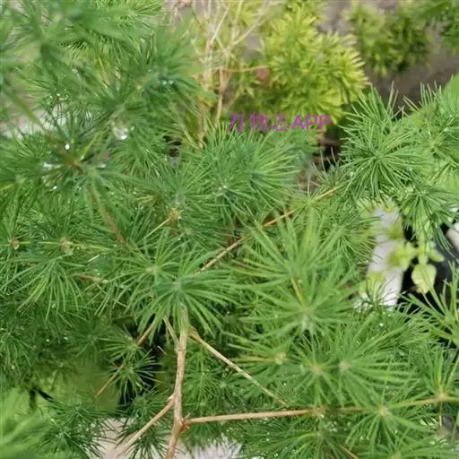 蓬莱松为多年生常绿草本植物。植株直立,高30~60cm,具小块根,多分枝,茎丛生。叶鳞片状或刺状,新叶鲜绿色。花淡红色,花期7~8月。株高1.5m左右,茎直立或稍铺散,木质化呈灌木状。具白色肥大肉质根。小枝纤细,叶呈短松针状,簇生成团,极似五针松叶.新叶翠绿色,老叶深绿色。花白色,浆果黑色。具小块根,有无数丛生茎,多分枝,灰白色,基部木质化,叶片状或刺状。新叶鲜绿色,老叶白粉状。叶状体扁线形,丛生,呈球形,着生于木质化分枝上,墨绿色。花淡红色至白色,有香气,花期7—8月。
