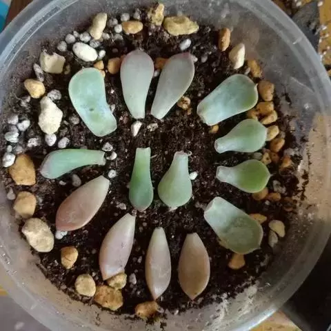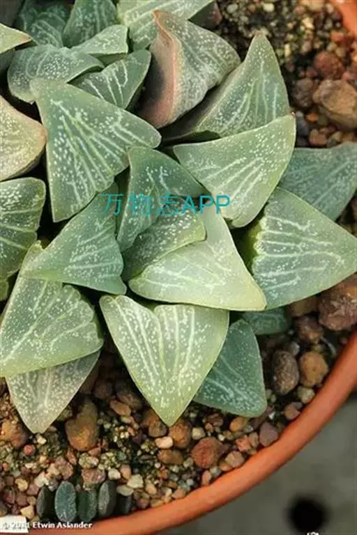 植株无茎,肉质叶排成莲座状,叶色深绿或褐绿色,先端卵圆状三角形,有浅色网格状脉纹,叶缘有细齿 。
