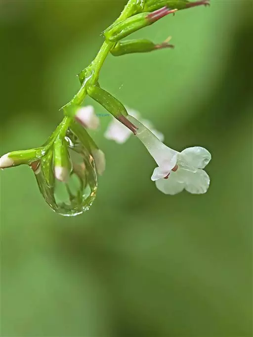 花冠漏斗状筒形,长6.5-7.5毫米,蓝紫色、淡红色至白色,外面无毛,内面于筒部远轴面被短柔毛;筒部长4-4.5毫米,口部直径约1.5毫米,基部上方直径约0.7毫米;檐部2唇形,上唇直立,长1.3-2毫米,先端2浅裂,下唇平伸,长2.5-3毫米,3浅裂,中央裂片较大。雄蕊4,着生于冠筒内面基部上方2.5-3毫米处,无毛;花丝狭线形,长1.5-1.8毫米,远轴2枚较长;花药肾状圆形,长0.3-0.4毫米,宽约0.5毫米。雌蕊无毛;子房斜长圆状披针形,长1.9-2.2毫米;花柱细长,长3-3.5毫米;柱头2唇形,下唇较长,长圆形。