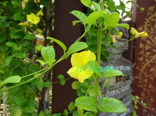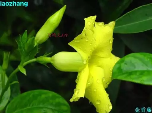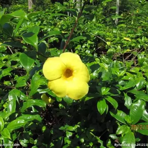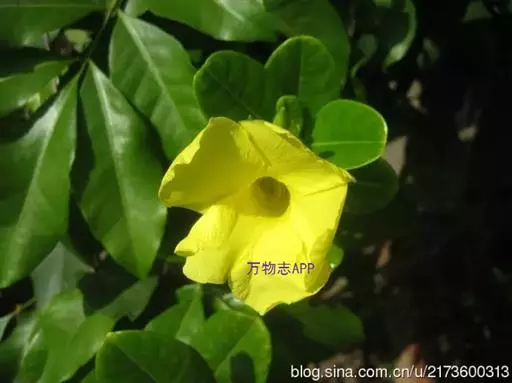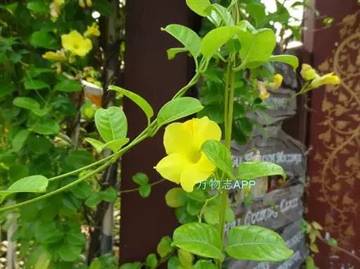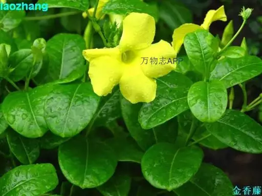 常绿藤本,茎有白色乳汁。叶对生,椭圆形,全缘,革质,富有光泽。花冠黄色,漏斗形。