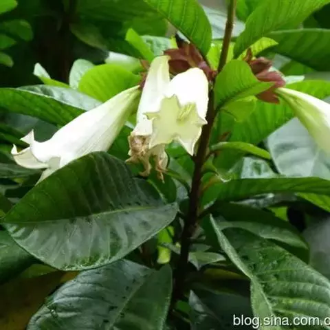 金香藤常绿缠绕性蔓性藤本,茎缠绕性,具白色体液;叶对生,椭圆形,先端圆或微突,全缘,革质,明亮富光泽。