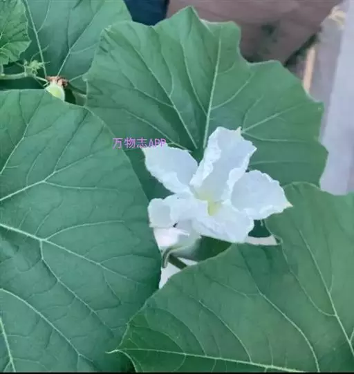 叶柄纤细,长16-20厘米,有和茎枝一样的毛被,顶端有2腺体;叶片卵状心形或肾状卵形,长、宽均10-35厘米,不分裂或3-5裂,具5-7掌状脉,先端锐尖,边缘有不规则的齿,基部心形,弯缺开张,半圆形或近圆形,深1-3厘米,宽2-6厘米,两面均被微柔毛,叶背及脉上较密。卷须纤细,初时有微柔毛,后渐脱落,变光滑无毛,上部分2歧。雌雄同株,雌、雄花均单生。