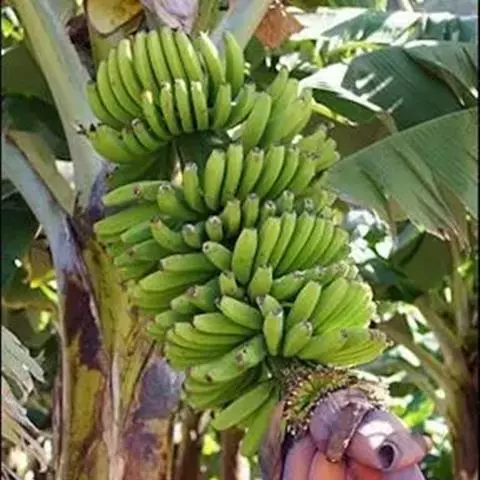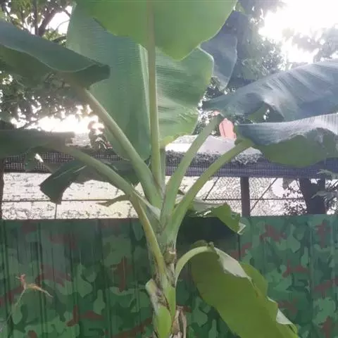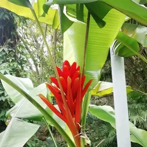 红蕉,假茎高1-2米。叶片长圆形,长1.8-2.2米,宽68-80厘米,叶面黄绿色,叶背淡黄绿色,…