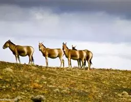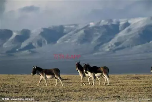 藏野驴属奇蹄目马科,是大型食草动物。藏野驴夏毛呈棕色,冬毛呈灰褐色,腹部及唇、腿的毛色较淡;身长2.3~2.4米,高约1.3米~1.4米,重达300多千克。藏野驴是典型的高原动物,分布于阿尔金山和昆仑山,生活在3000米以上的高原盆地。它们喜欢成群活动,一般是一头强壮的公驴和数头到十几头母驴组成。主要以山上的针茅、苔草、植物为食,一般在每天的晚上和傍晚饮水。
