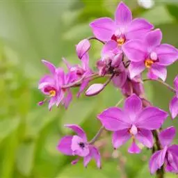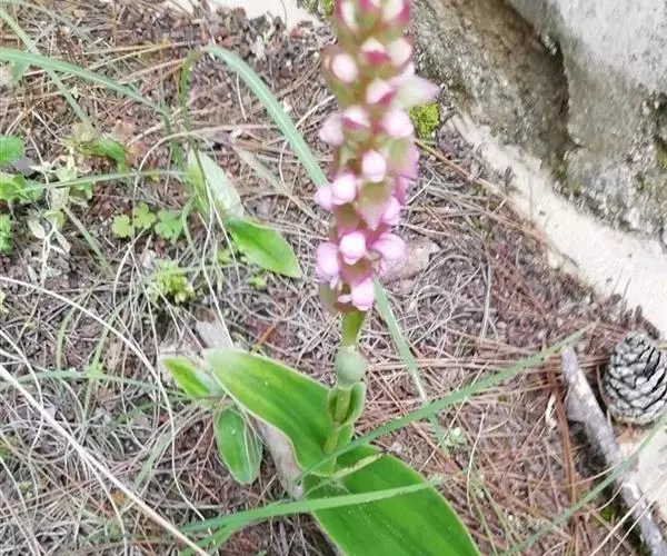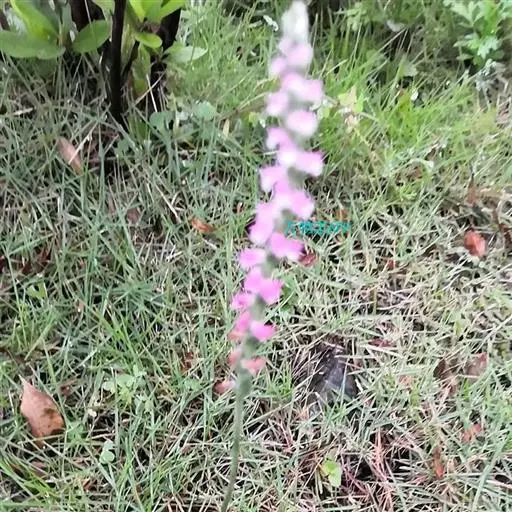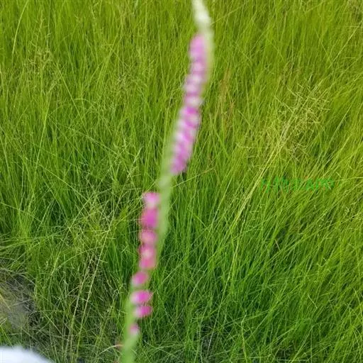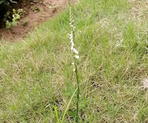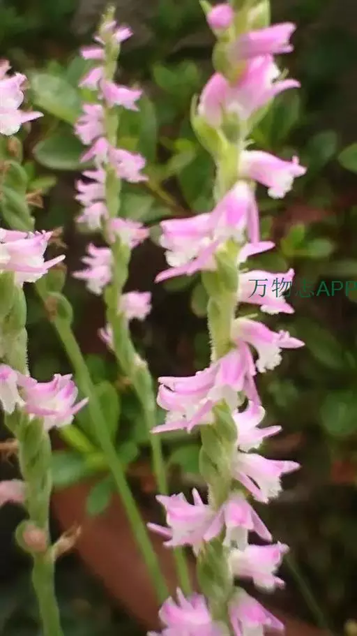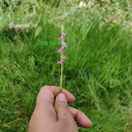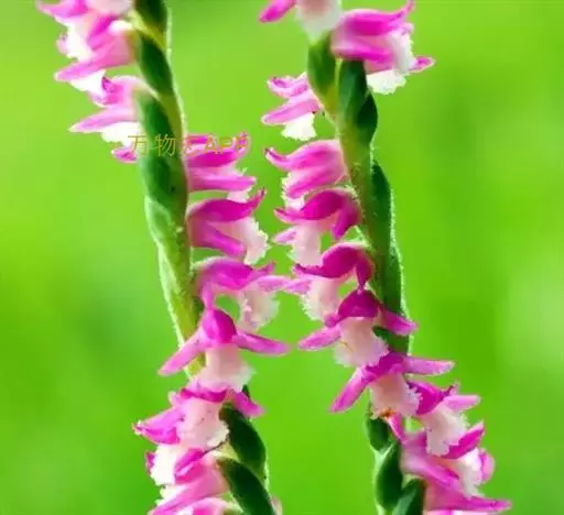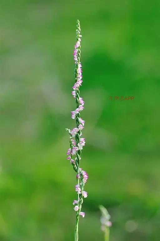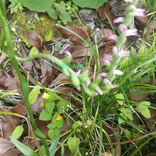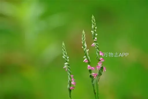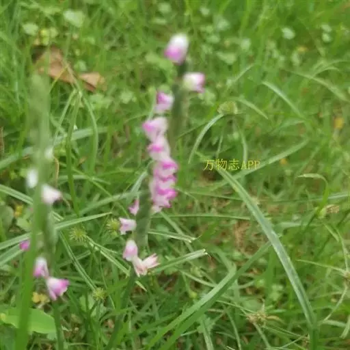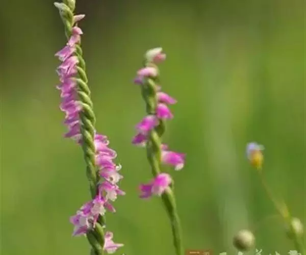 绶草(学名:Spiranthes sinensis (Pers.) Ames):植株高13-30厘米。根数条,指状,肉质,簇生于茎基部。茎较短,近基部生2-5枚叶。叶片宽线形或宽线状披针形,极罕为狭长圆形,直立伸展。花茎直立,长10-25厘米,上部被腺状柔毛至无毛;总状花序具多数密生的花,长4-10厘米,呈螺旋状扭转;花小,紫红色、粉红色或白色,在花序轴上呈螺旋状排生;萼片的下部靠合,中萼片狭长圆形,舟状,长4毫米,宽1.5毫米,先端稍尖,与花瓣靠合呈兜状。花期7-8月。